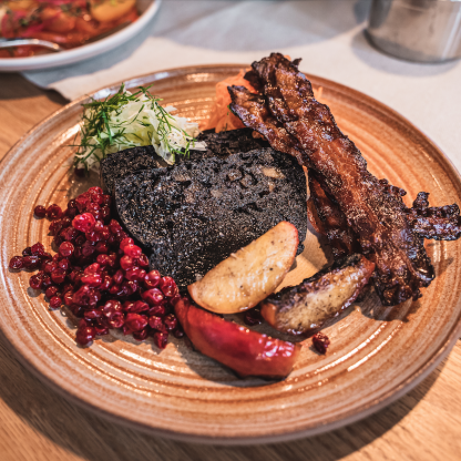 Aptitlig blodpudding kryddad med ingefära och till en fruktig blandning av fräst lök, äpplen och bacon. Servera med en klick lingonsylt eller rårörda lingon